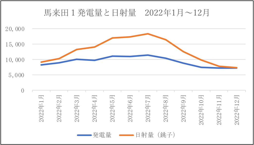 日射量は気象庁「過去の気象データ」で銚子を参照。馬来田と銚子は80kmほど離れています。